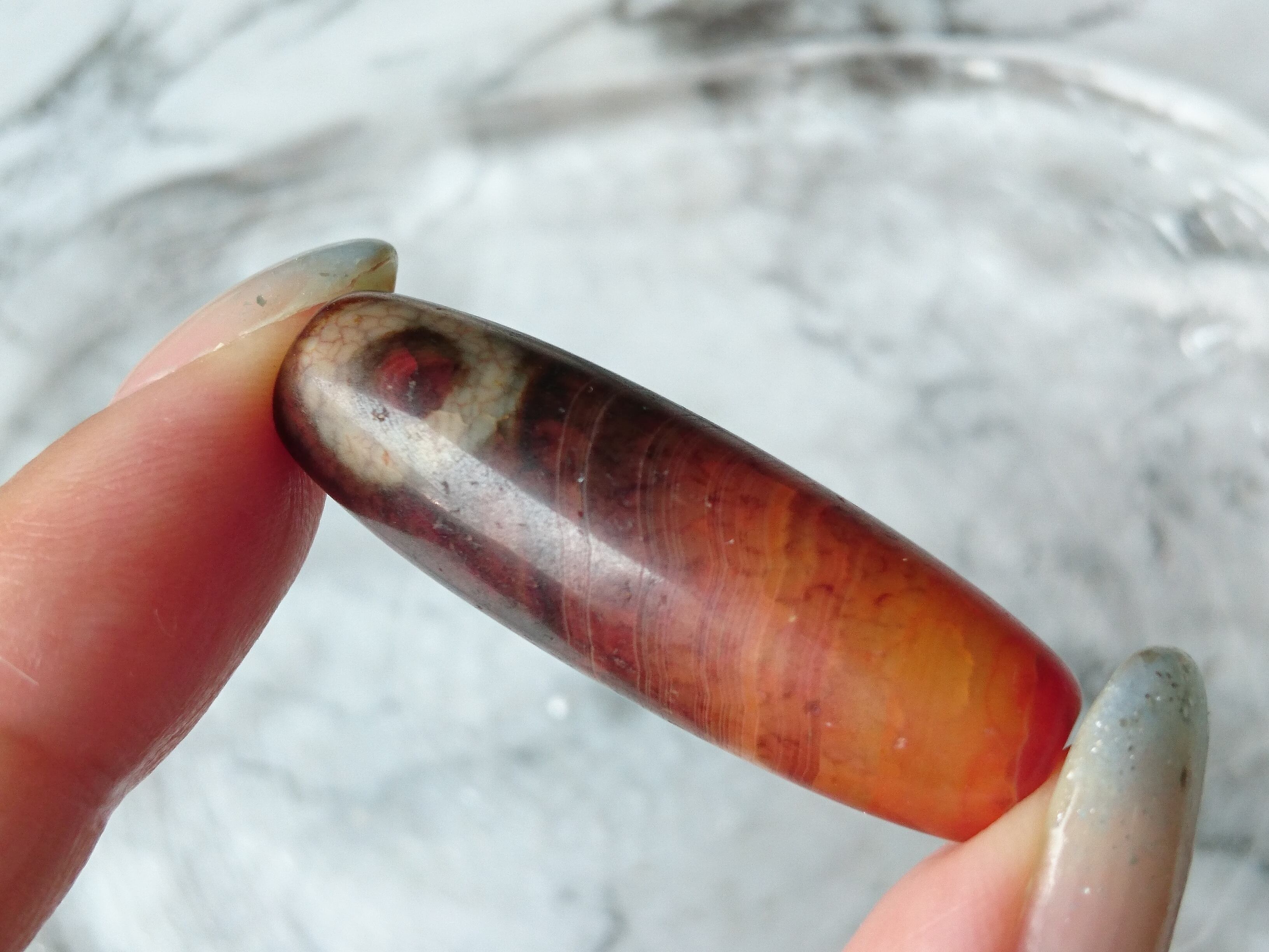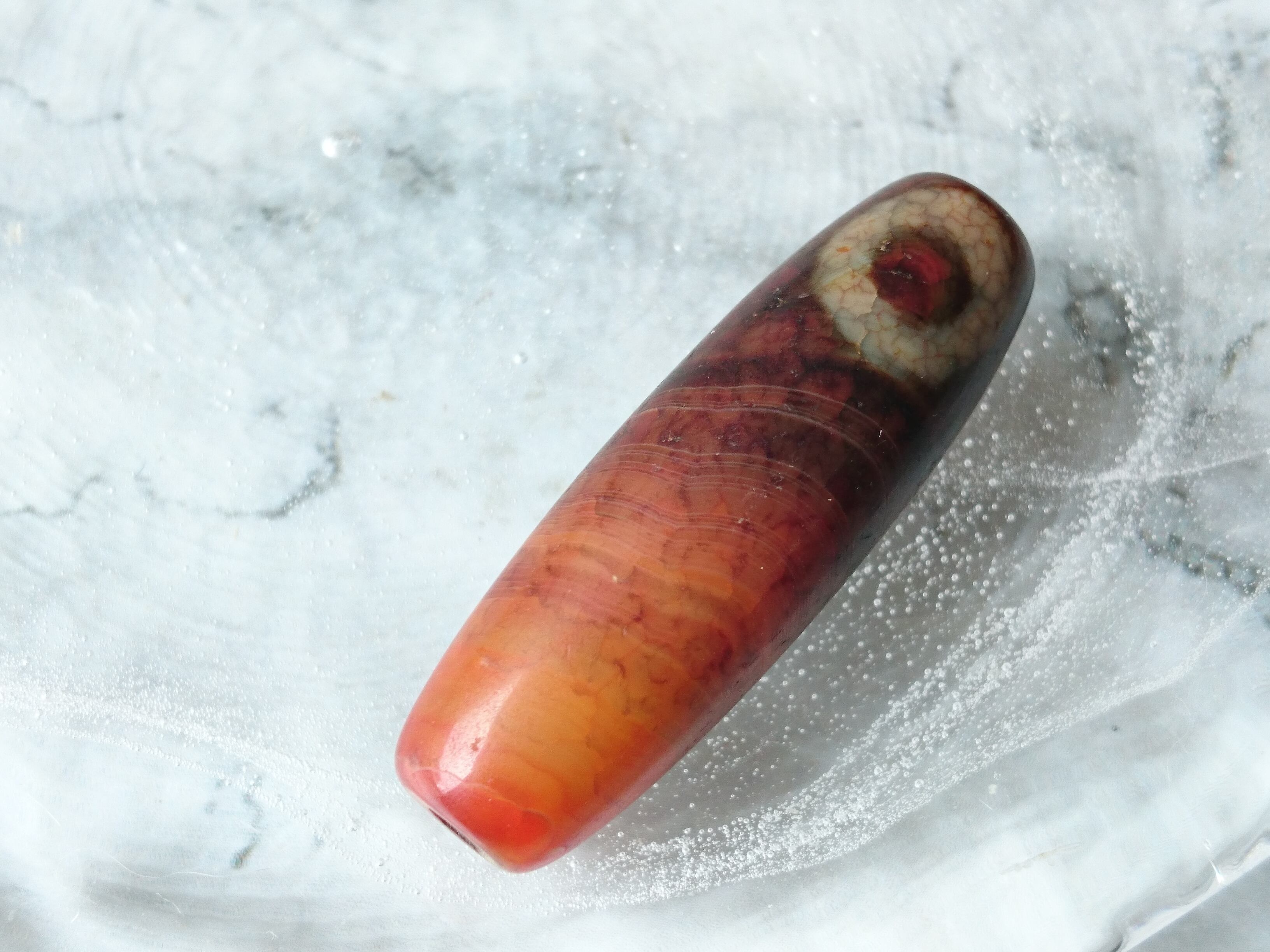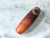 老天珠と同じ原石を使用し、朱砂を導いた天珠です。朱砂が出る天珠は大変パワーが強く、朱砂が多く出る最高級の原石がありました。ヒマラヤ山脈から採れる神聖な老礦石という瑪瑙の中でも最高級の原石です。