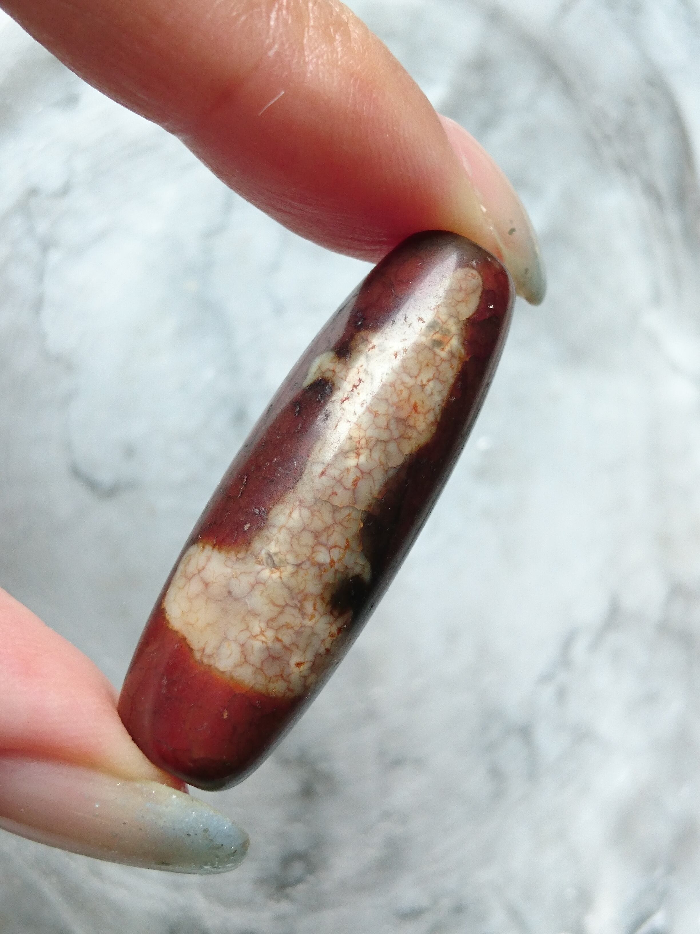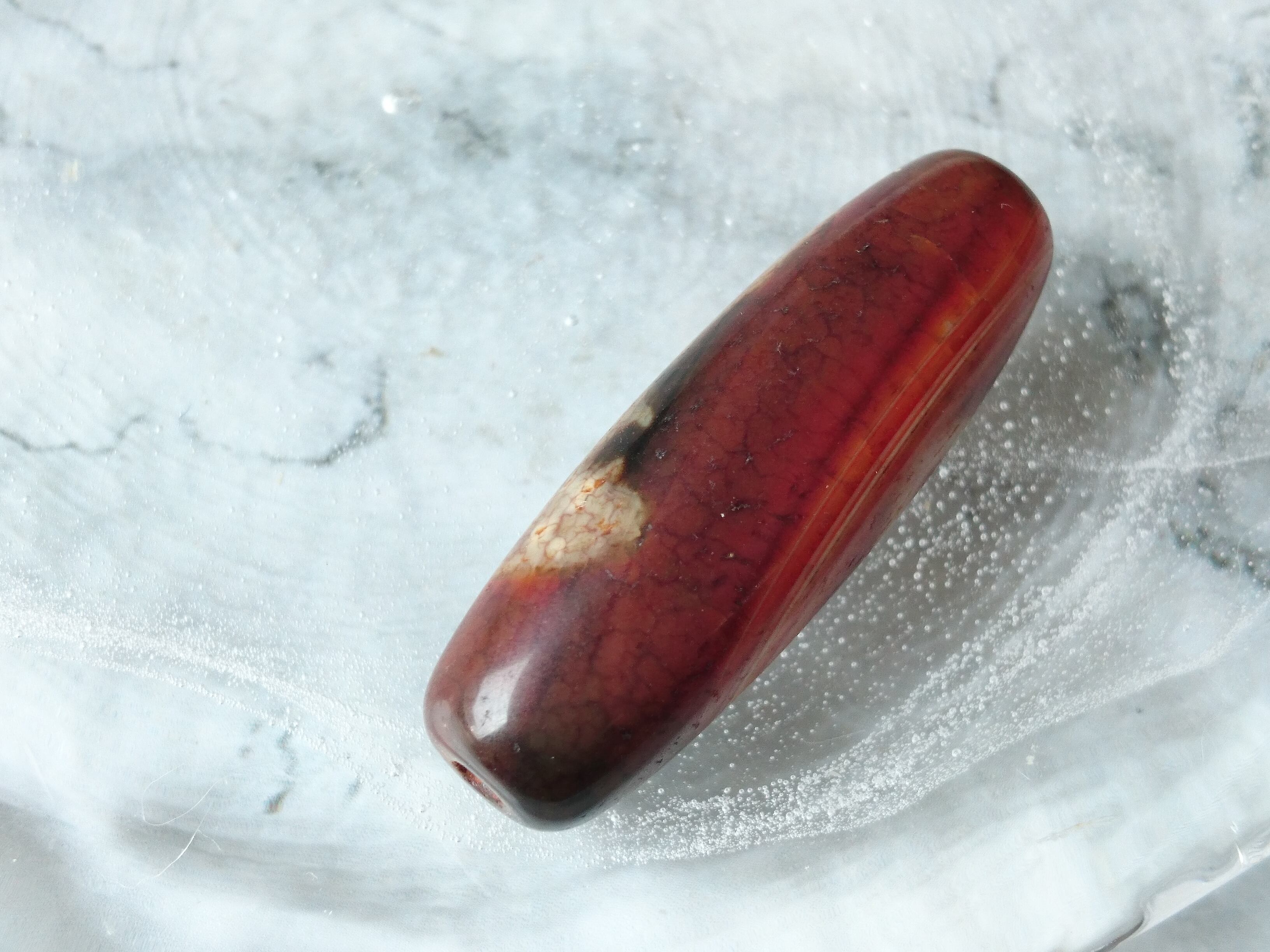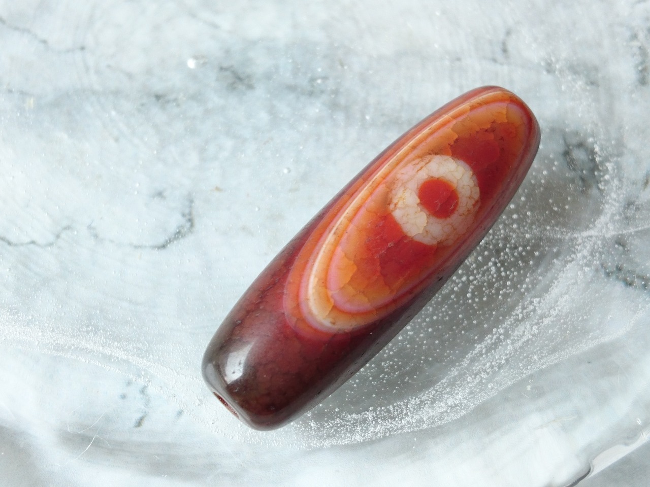 老天珠と同じ原石を使用し、朱砂を導いた天珠です。朱砂が出る天珠は大変パワーが強く、朱砂が多く出る最高級の原石がありました。ヒマラヤ山脈から採れる神聖な老礦石という瑪瑙の中でも最高級の原石です。