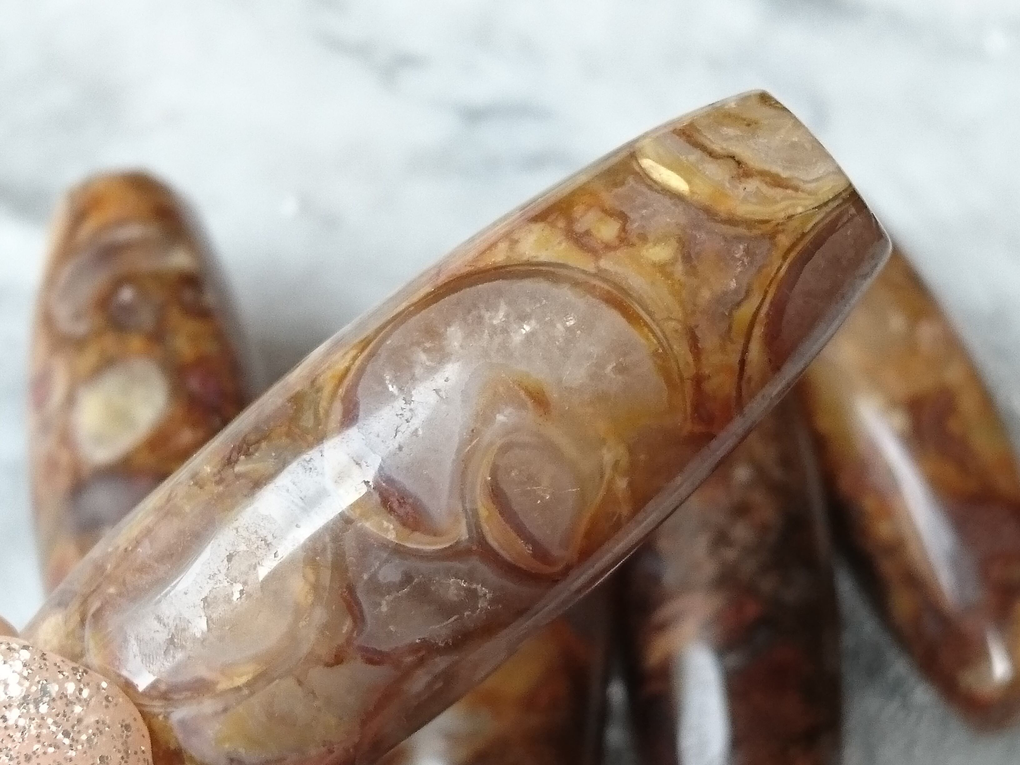 この天珠に使われる化石は非常に希少なもののため法螺天珠は流通量が少なく日本では殆ど見られない天珠のひとつ。