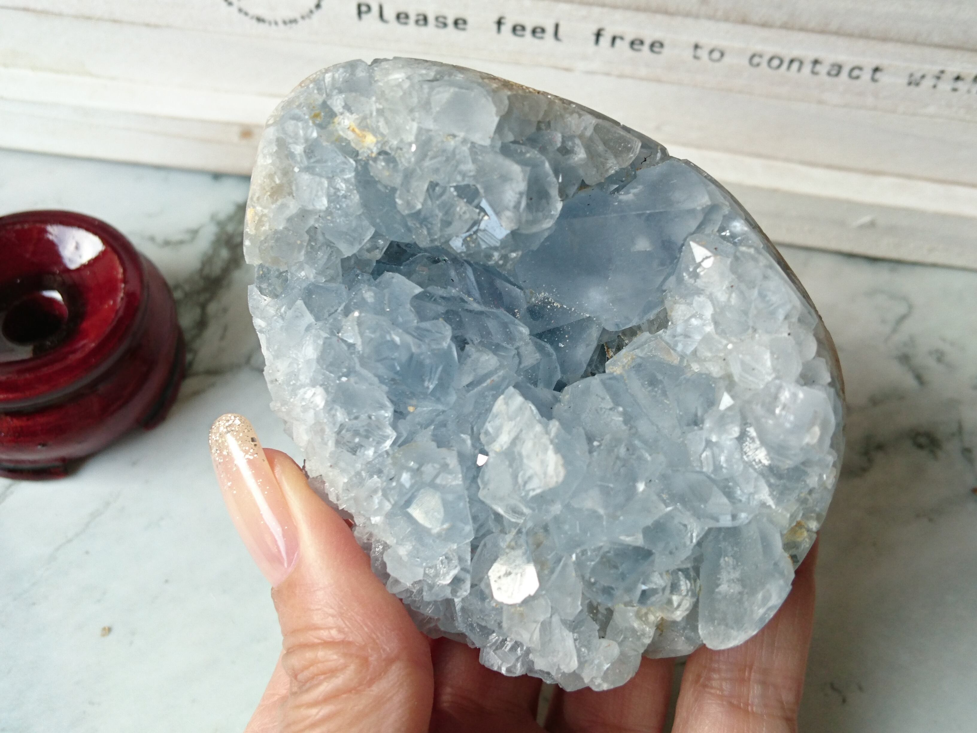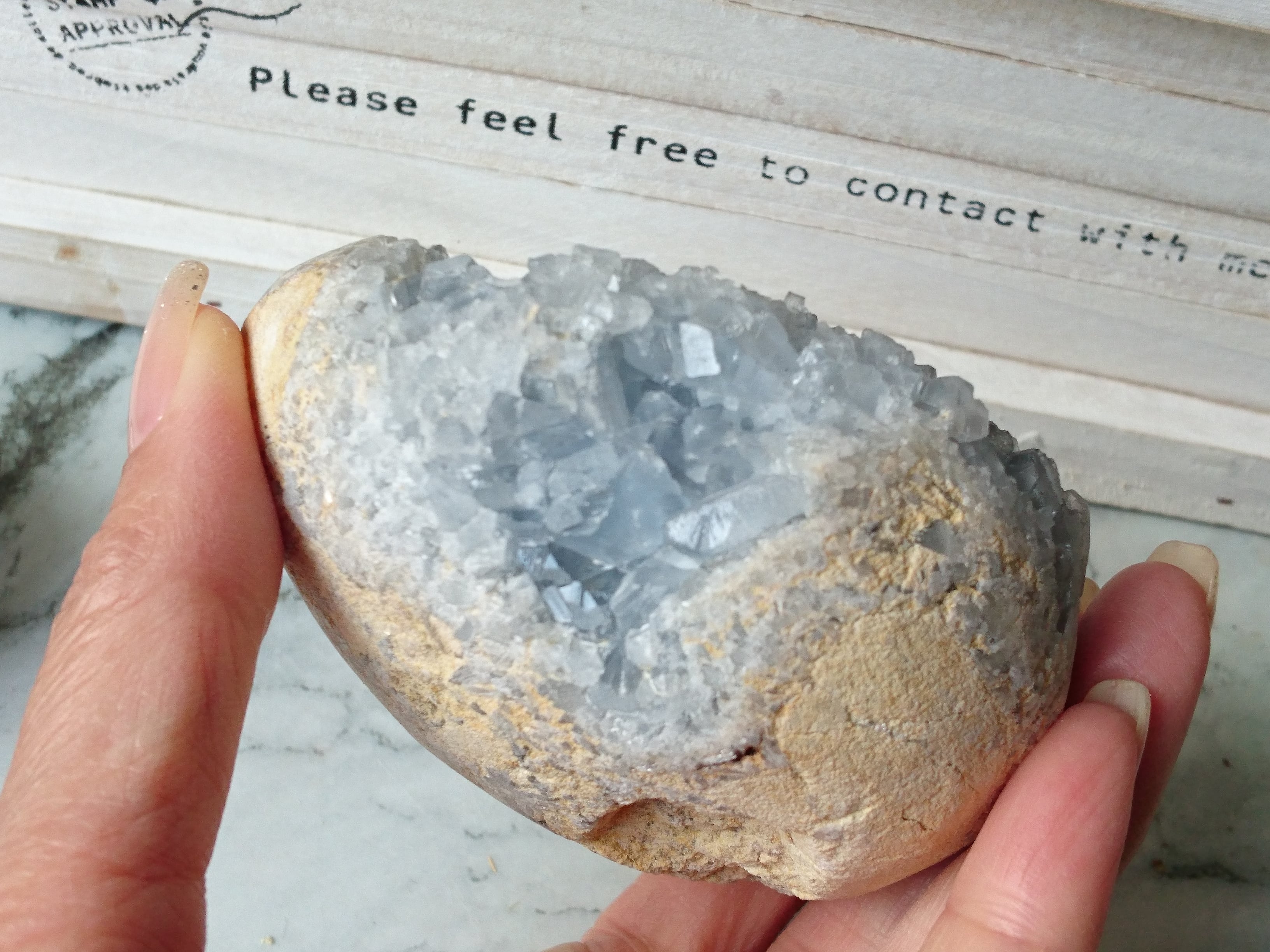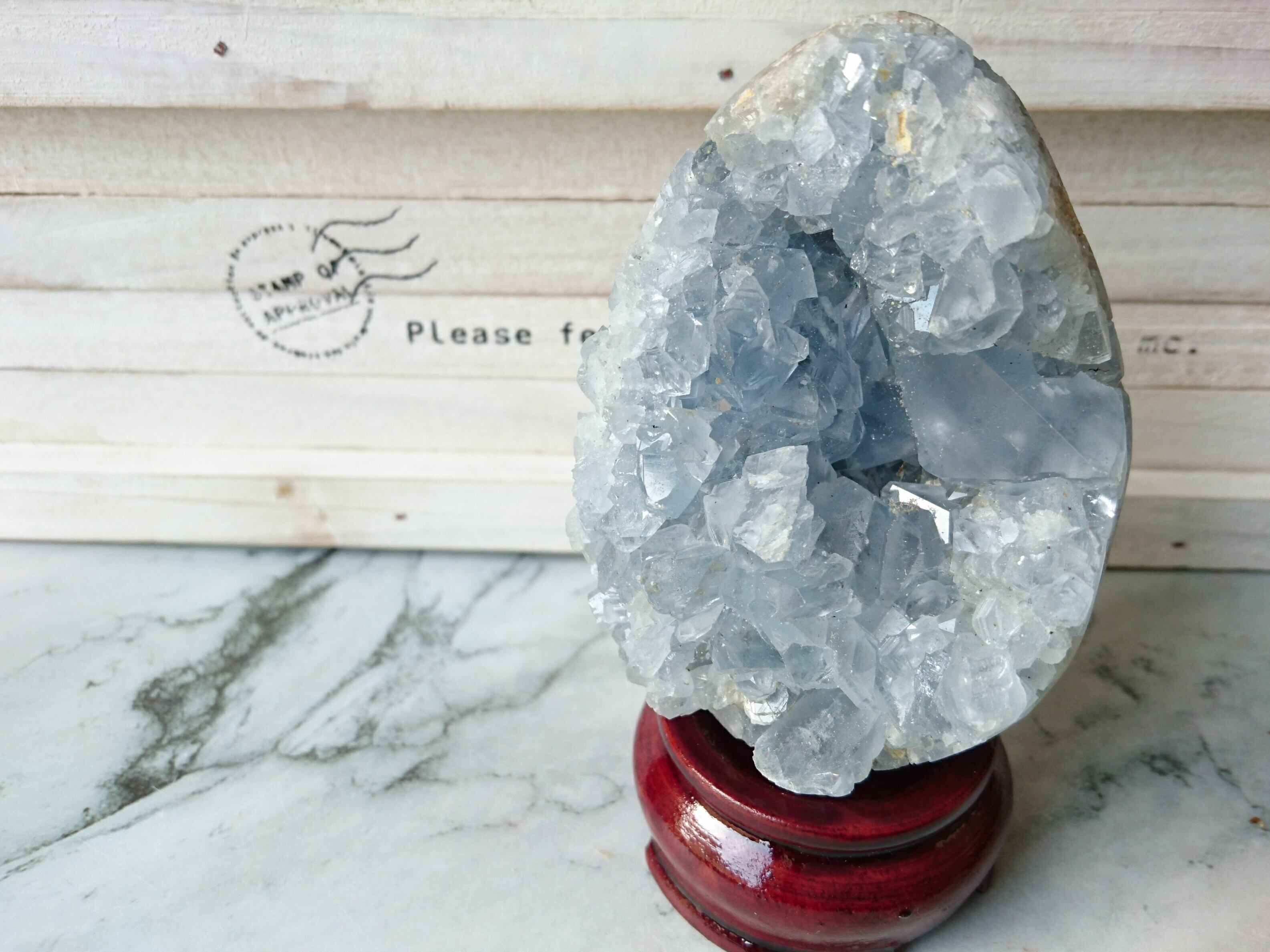 セレスタインはガラス光沢を持つ淡青色をした美しい石です。英名は、ラテン語で天を意味する "coelestis" という単語に由来しています。