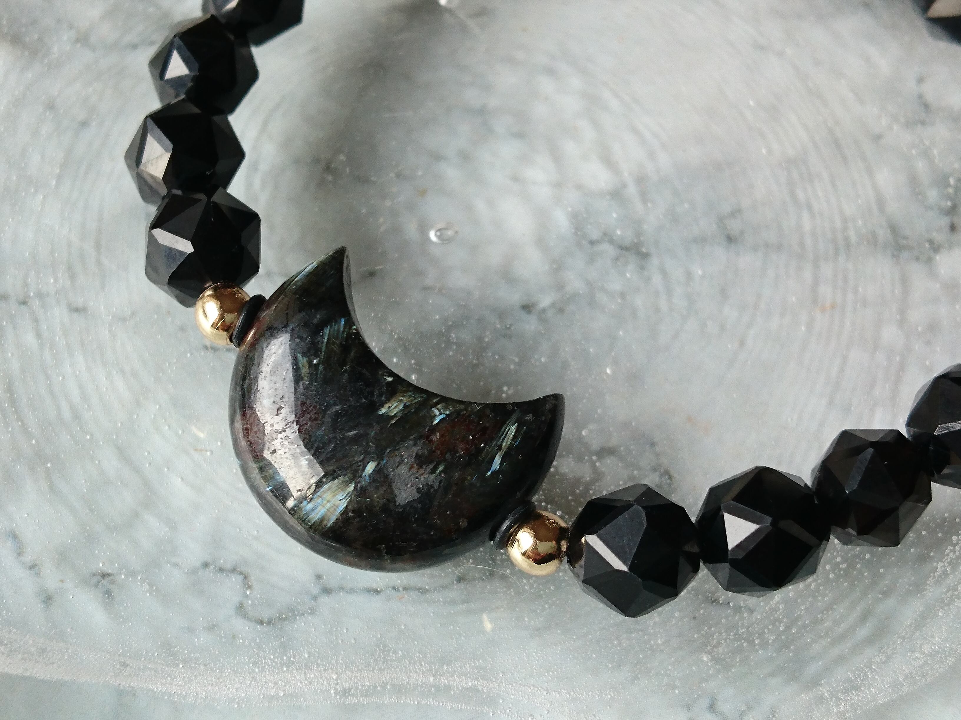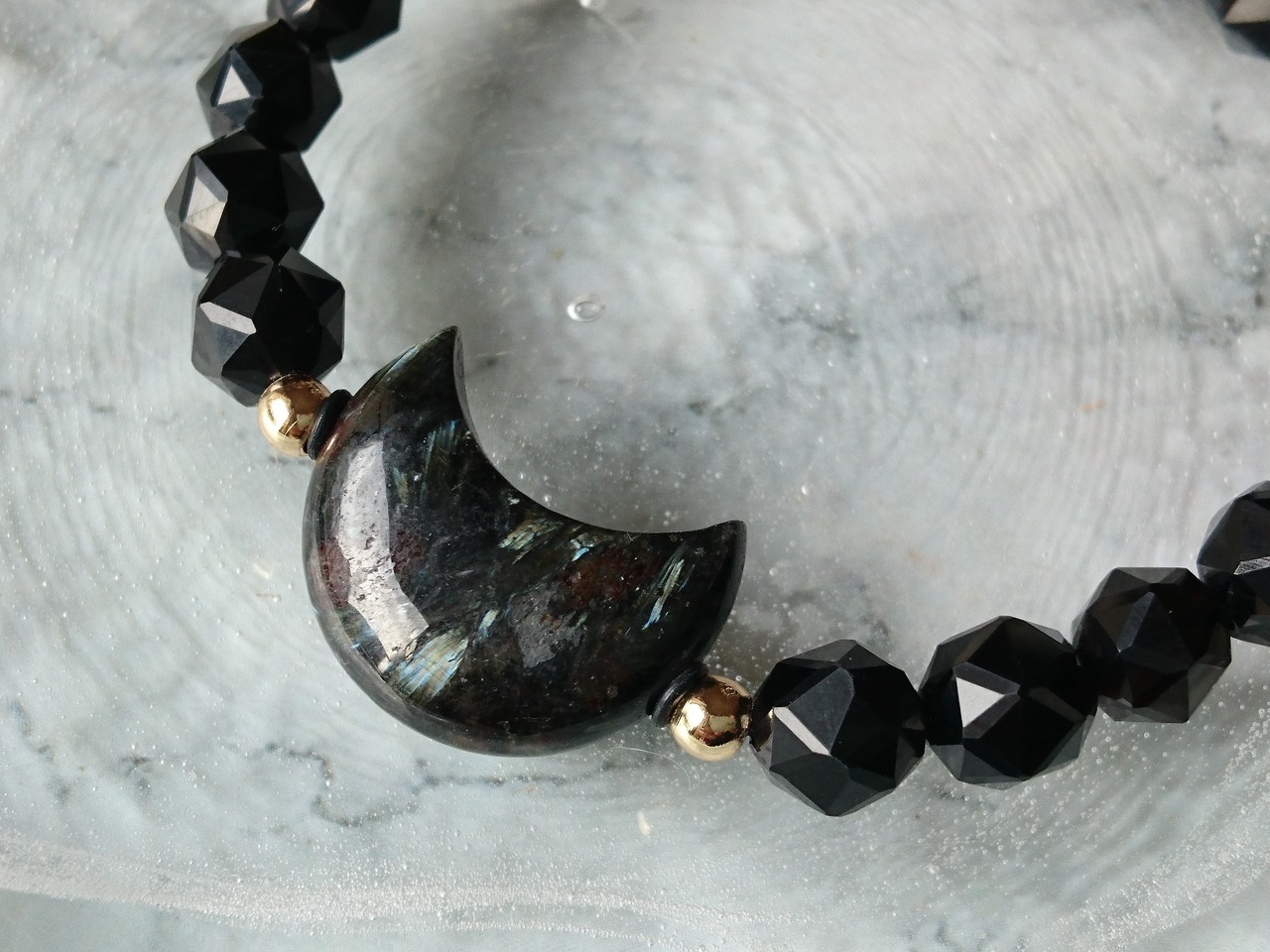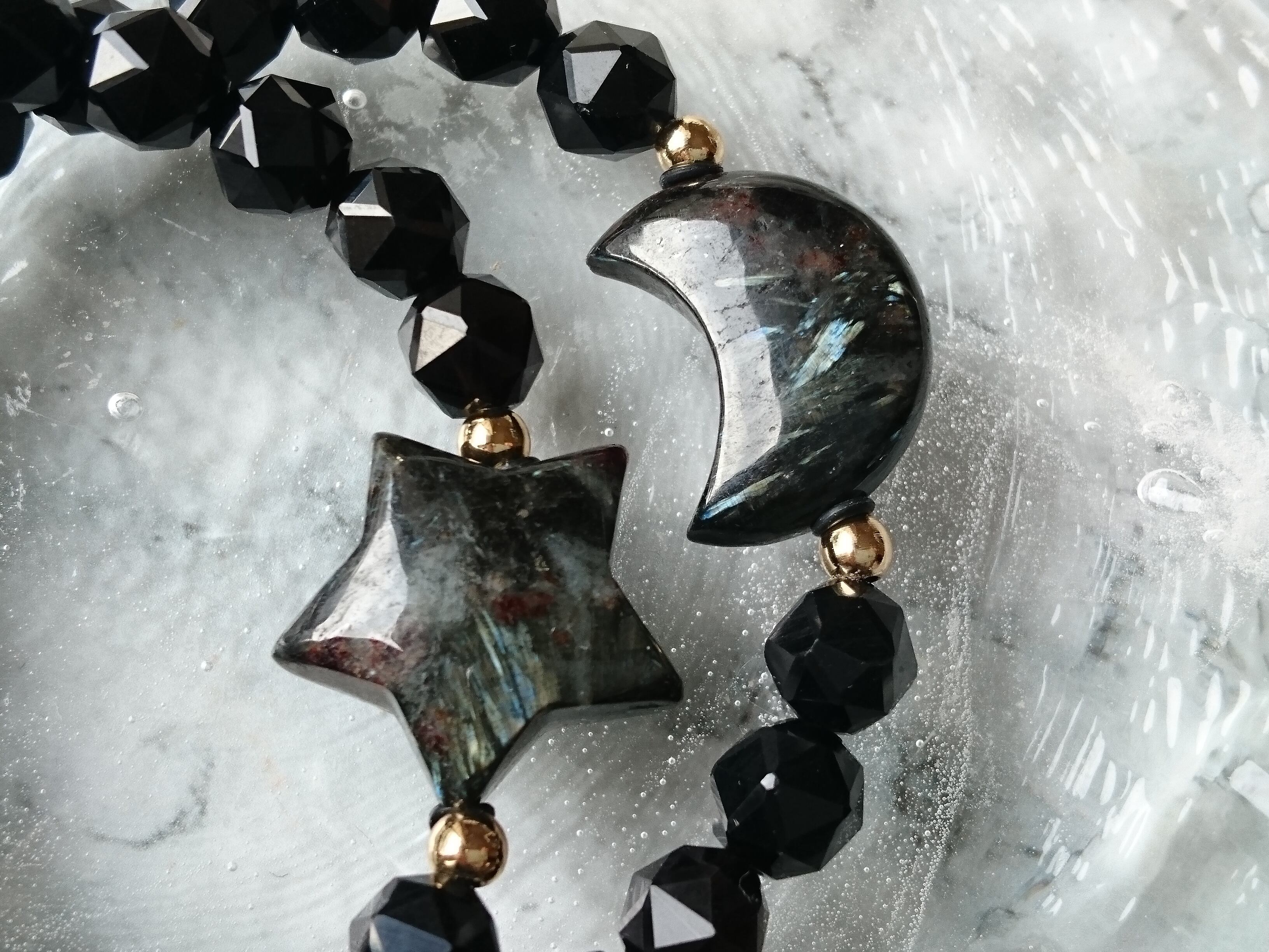 ブルーシラーがキラキラ光るガーネットヌーマイト月、星と美しいブラックカラーのチベットモリオンスターカットです★