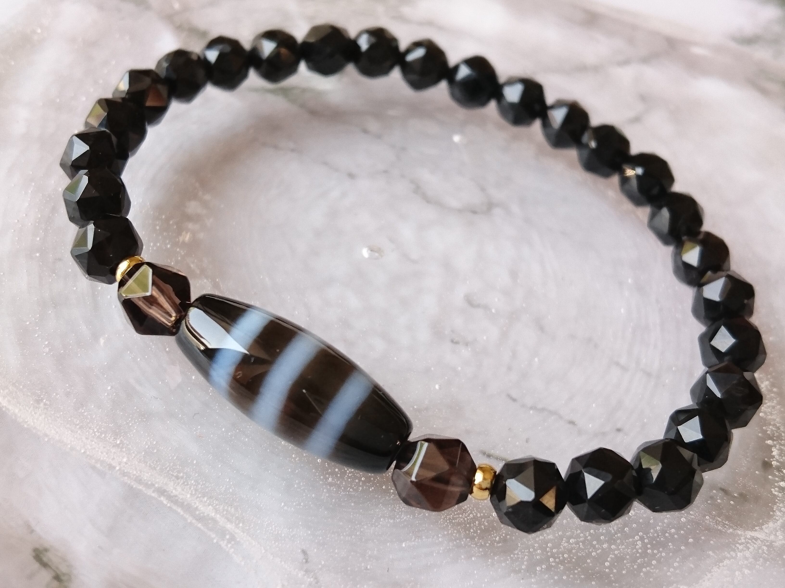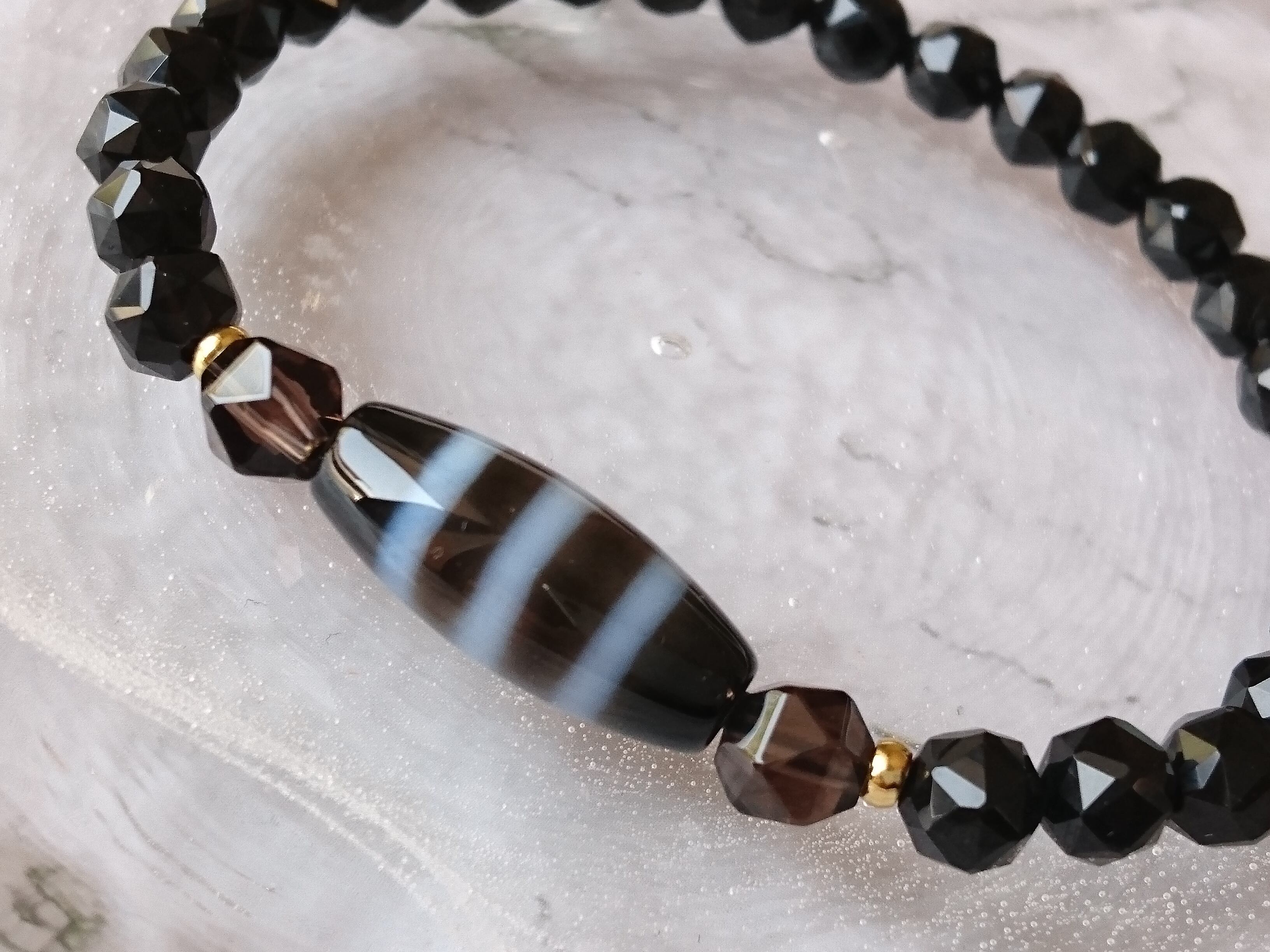 ミニの線天珠と艶やかなブラックカラーと美しいカットのチベットモリオンです✨
