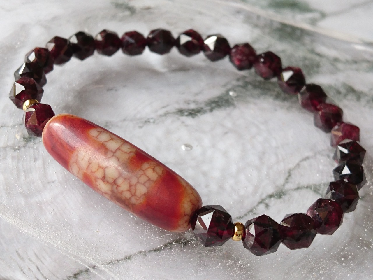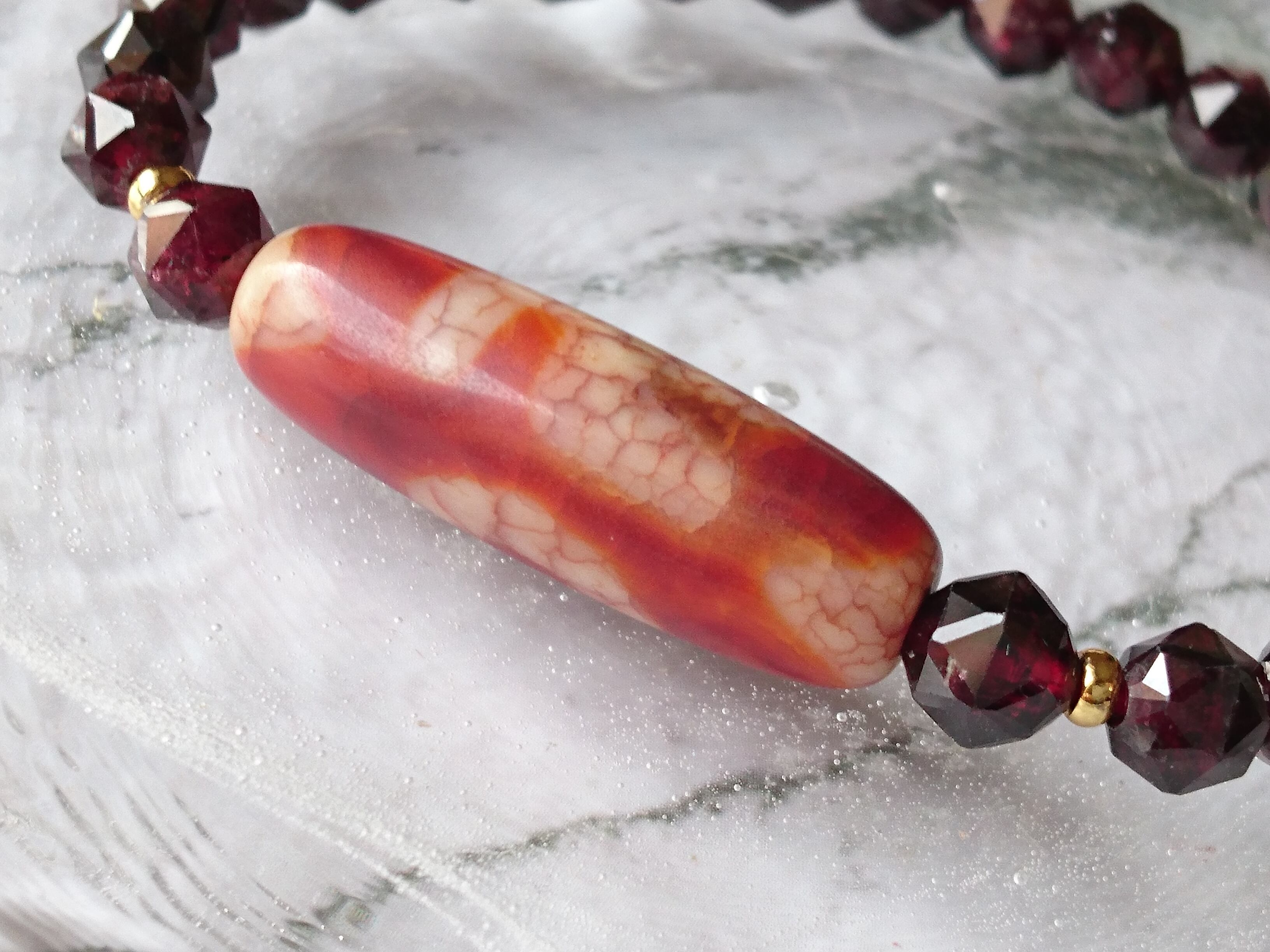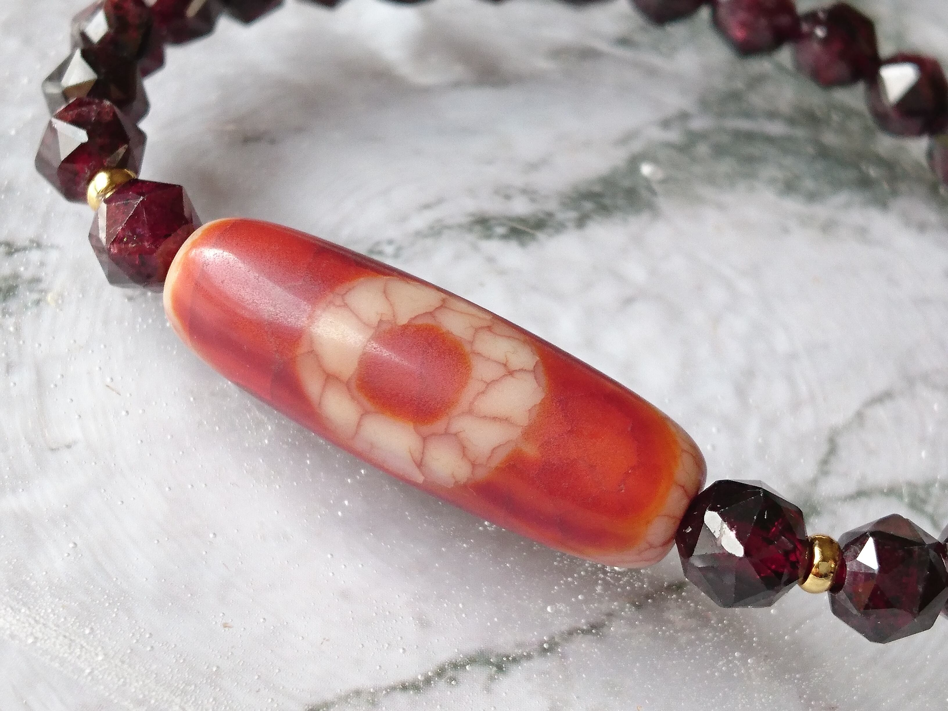 木目のような模様の卍一眼天珠とキラキラスターカットガーネットです✨