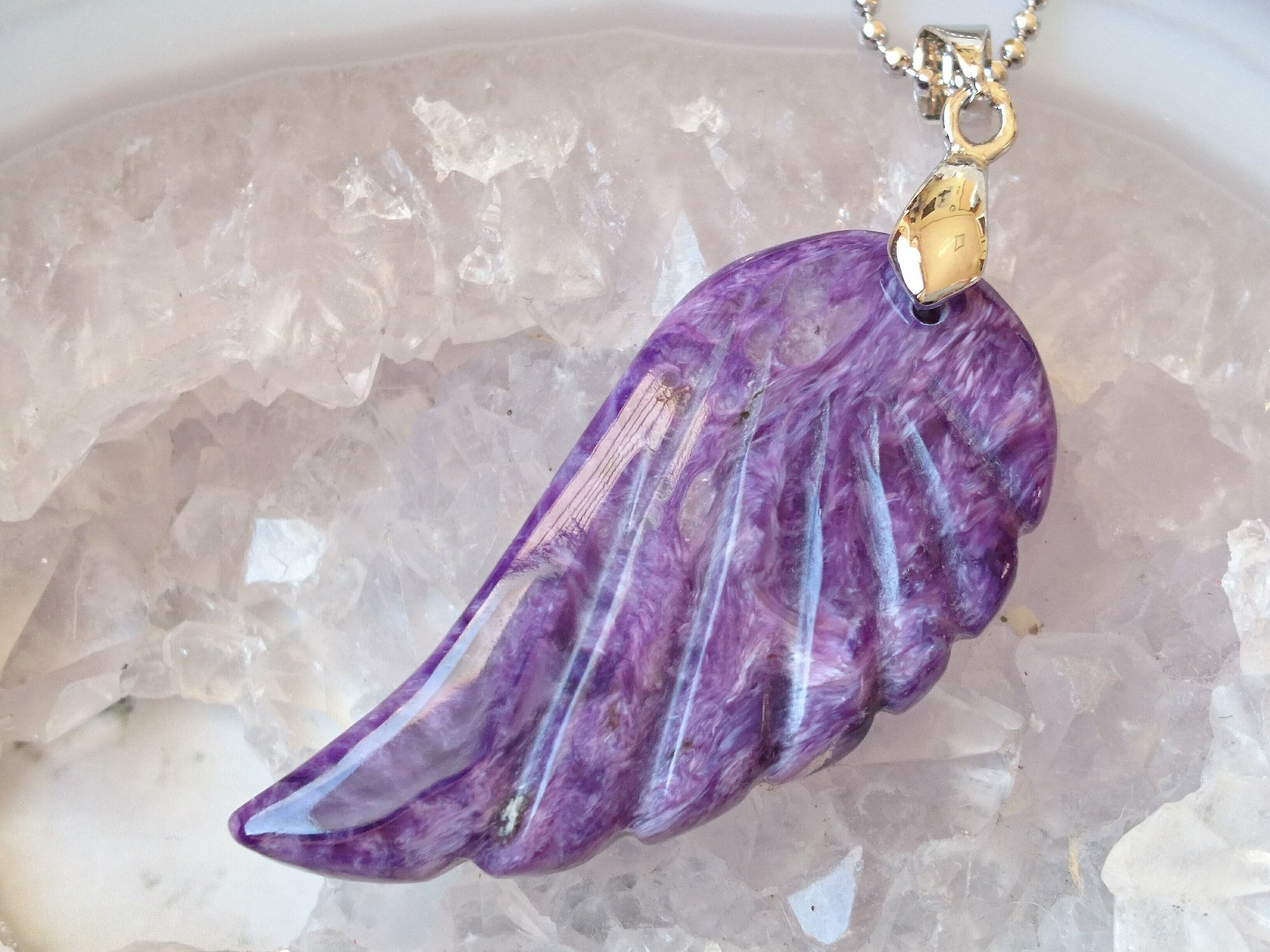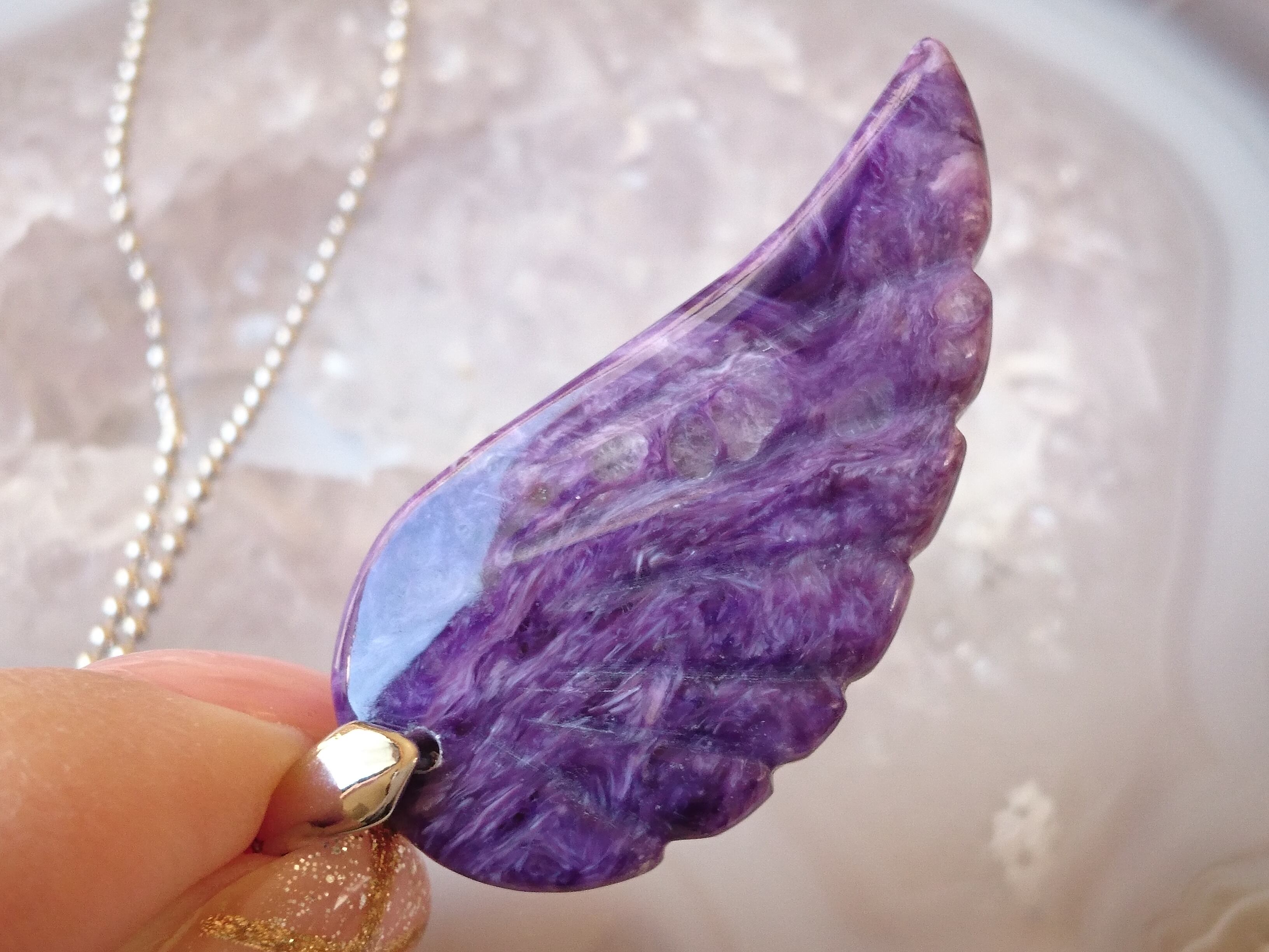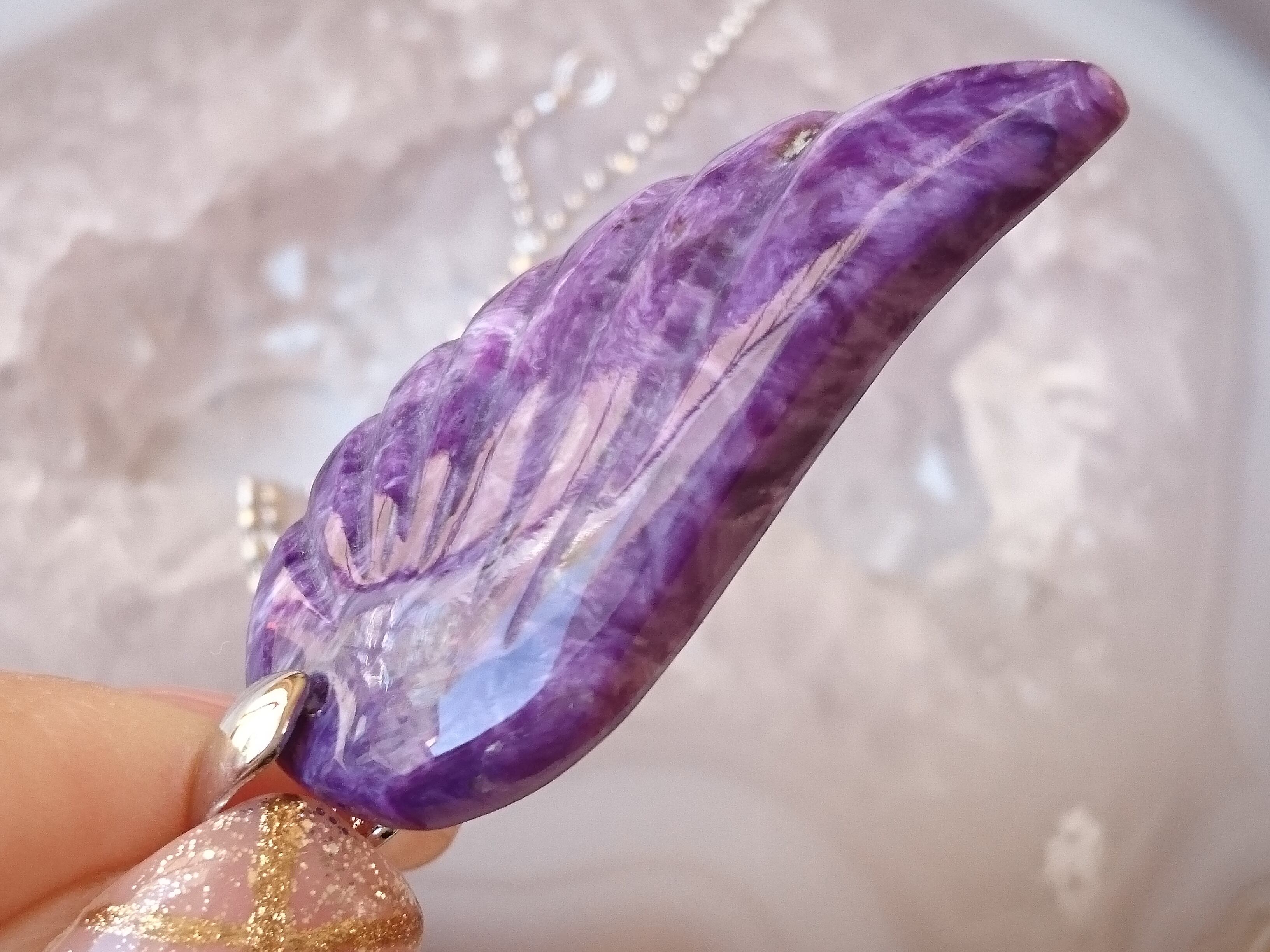 両面美しいマーブル模様のチャロアイトです✨美しい手彫り羽カービング✨