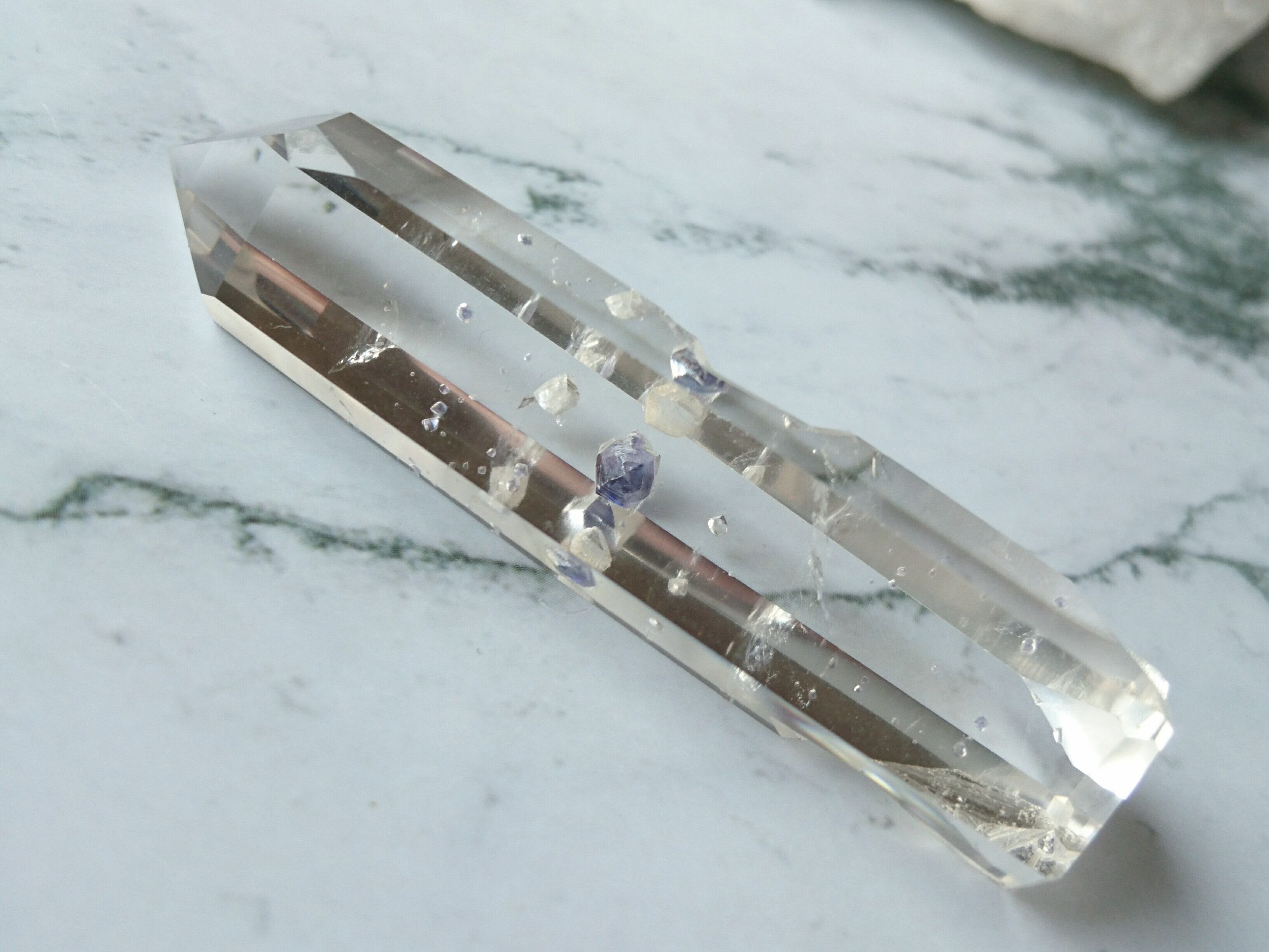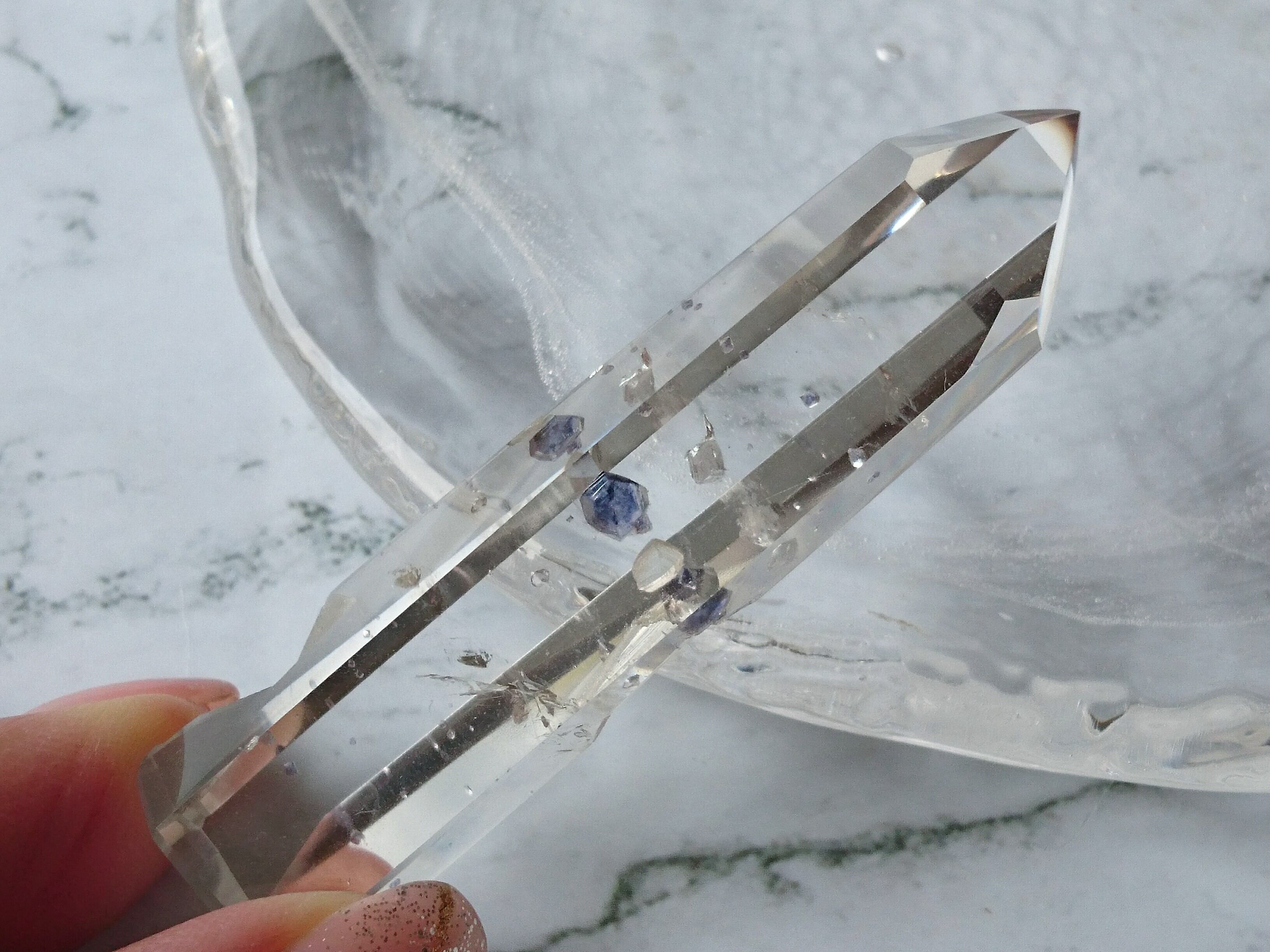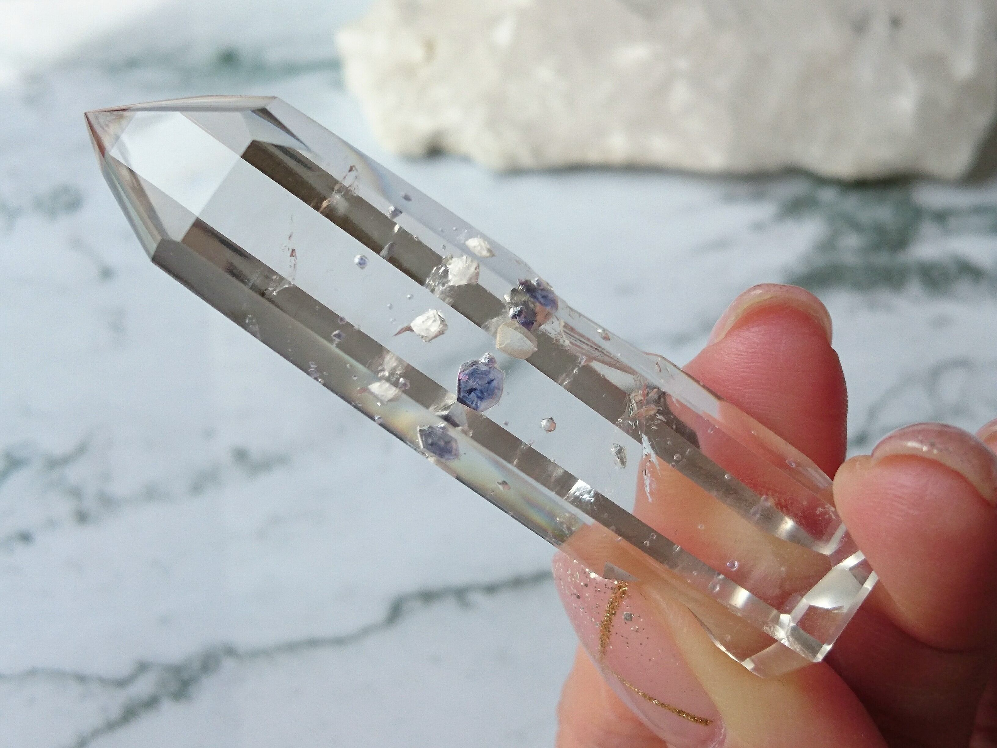 完璧クリアな水晶にブルーの八面体フローライトインです✨