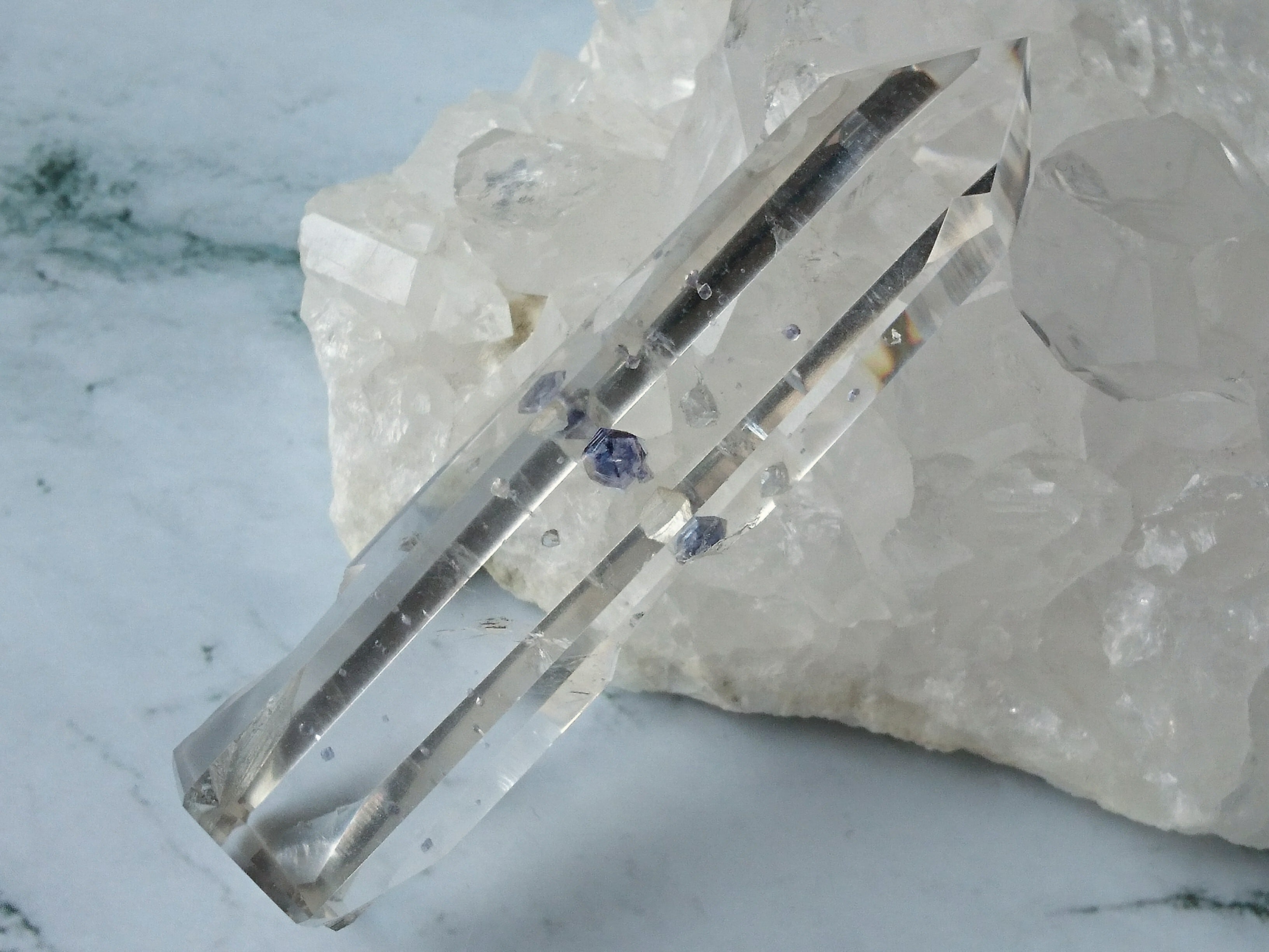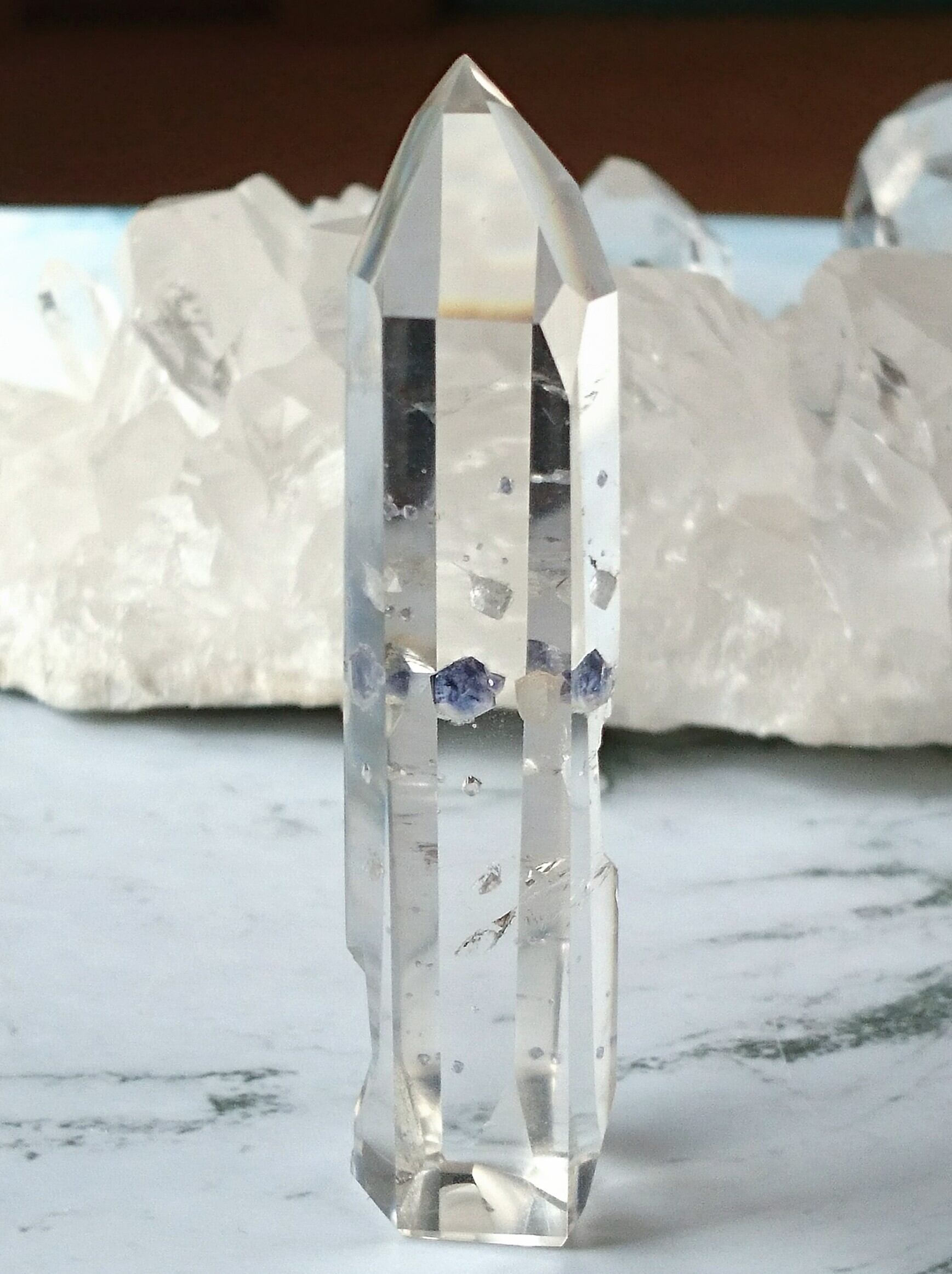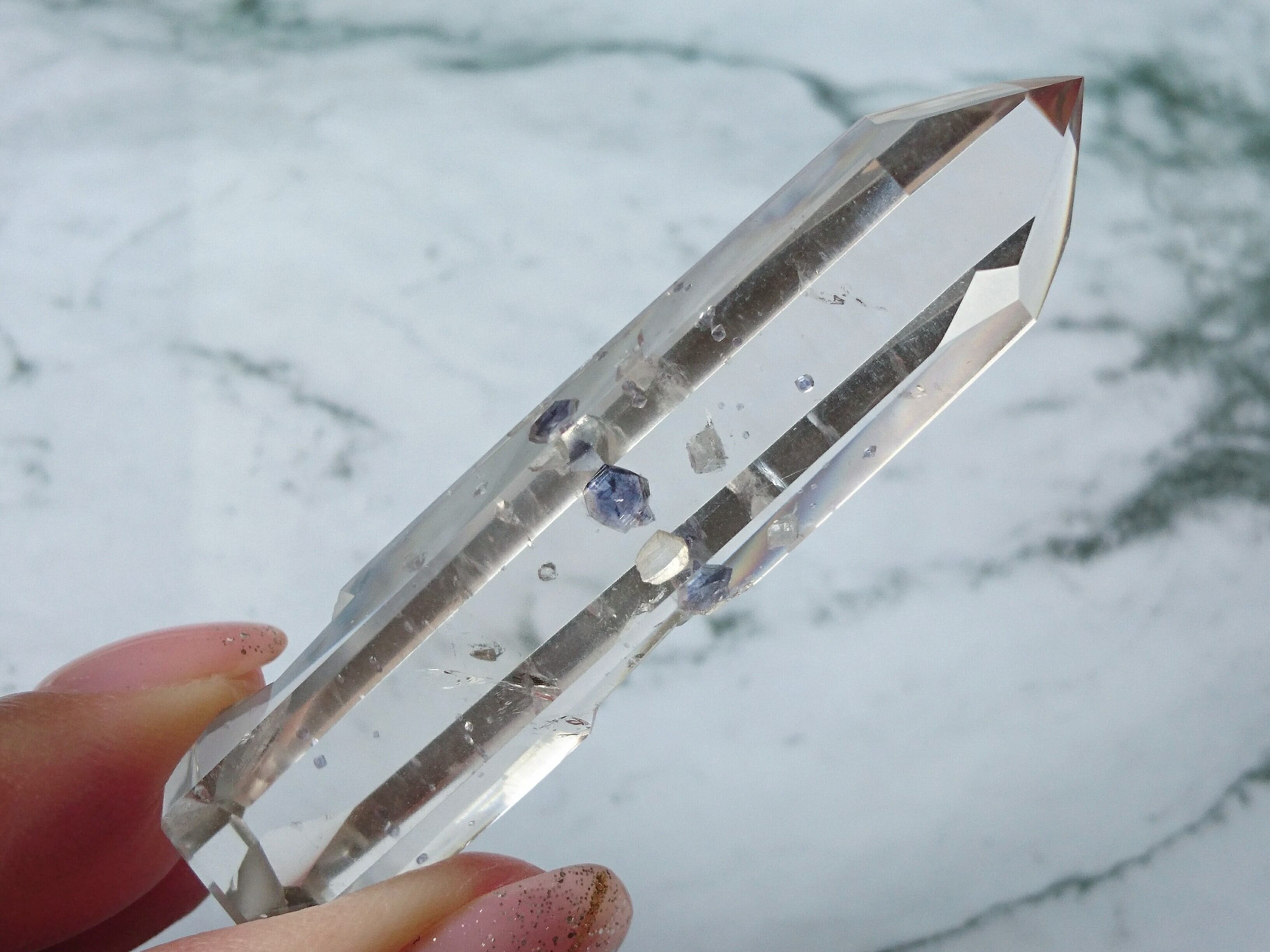 完璧クリアな水晶にブルーの八面体フローライトインです✨